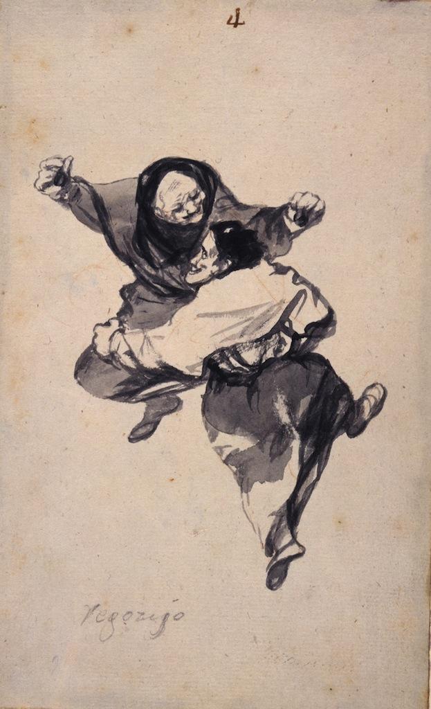 Francisco Goya, Old Women Fight Too, c. 1819-23 Brush, black and grey ink, Madrid, Biblioteca Nacional de EspanaGoya was in his seventies by the time he produced the series of 22 drawings making up the Witches and Old Women album, c.1819-23, reunited here for the first time since his death. Some 25 years earlier he had suffered a near fatal illness that left him profoundly deaf and it is tempting to imagine that his own experiences of infirmity had made him sympathetic towards the elderly. Tempting it may be, but then what are we to make of the covetous old hag counting her bags of money on the preceding page? Or the sheet that follows, entitled What Folly, Still to Be Thinking of Marriage?