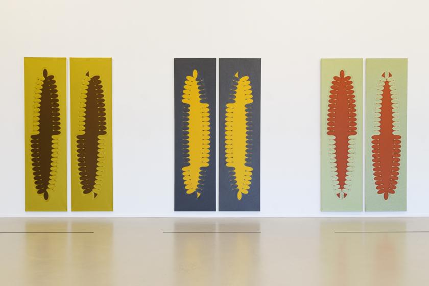 Her ellipses don’t compromise, and refuse to offer us as many referents as circle, grid or square. (Do the maths and you will find that, with an equation such as x2a2+y2b2=1, the elongated circle is an altogether more complex form). There is nothing simple about painting an oval. These ellipses often multiply, appearing two by two, or four by four. It is never clear what they mean, but owing to their proliferation, we come to believe they mean something.