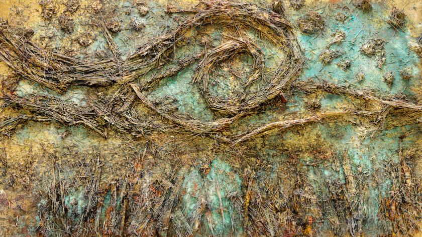 Named after the Greek gods of love and death, Eros and Thanatos, 2013-19, addresses the twin forces that govern existence. This time, though, Kiefer hammers home the message by attaching the kind of scythe once used by farmers for harvesting grain and by the Grim Reaper for gleaning souls to an expanse of empty furrows gleaming only with gold leaf. And the result is dreadful kitsch.