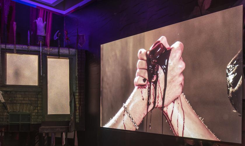 A cluster of disaffected queens have come to this desert stronghold “looking for the same thing… a kind of love as violence.” A series of non-sensical snippets combines to create an atmosphere of pleasurably perverse derangement. An array of mediaeval weapons or “genital accessories” is shoved up willing arses; a man with a horse’s head strapped to his chest pulls a make-believe carriage; bones fall from the sky onto the stoney desert, blue and white plastic suits are worn; a cake facsimile is dismembered and its jammy entrails smeared over a victim. Deliberately tacky make-believe illustrates Shakespeare’s observation that “all the worlds a stage and all the men and women merely players…. And one man in his time plays many parts.”