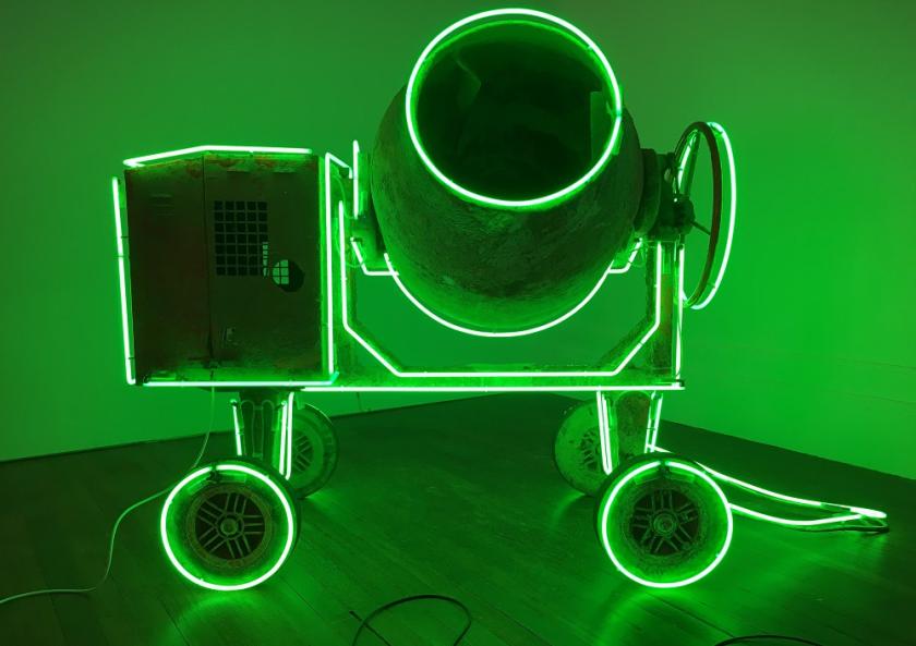 Of course unlike the conventional line, neon isn’t confined to a page. In two sculptures by David Batchelor the tubes are adapted to literally highlight the edges of a ladder and a cement mixer (main picture). This luminous adornment lends the everyday hardware a futuristic look, but it’s also a reminder of neon’s evolution into a grungy material, rather than a symbol of luxury. It’s that chequered cultural history that has clearly appealed to several artists. Curator Richard Parry reminds us that, “one of the fascinating things about neon is that it has endured. It manages to be futuristic and vintage at the same time.”