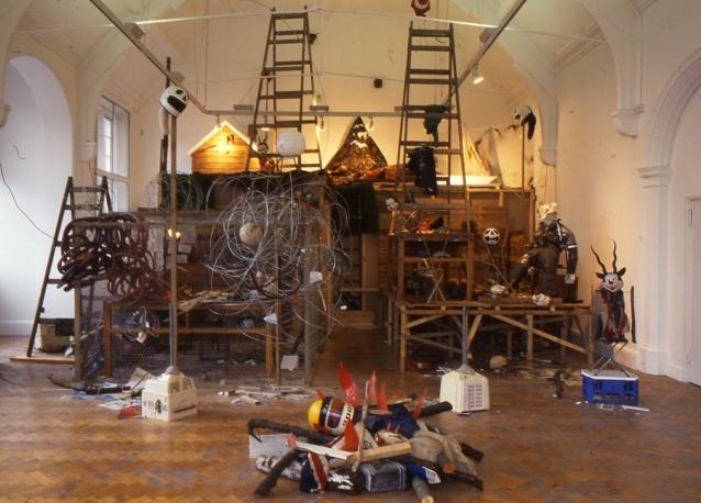 Mike Nelson has recreated an installation he made in 1998 during a residency. An array of oddities including biker helmets painted to resemble skulls and a Mickey Mouse head sprouting gazelle horns is arranged like an unfinished display of hunting trophies. Access is through a storeroom cluttered with junk – the raw material for additional items – which makes the assemblage seem even more provisional. Ironically, Nelson spent four weeks rebuilding this ad hoc display, as though he were a museum curator reconstructing the work of a dead artist.