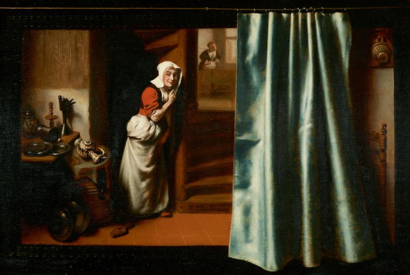 The maid is all ears and, to ensure we don’t miss a thing, she signals to us to keep quiet and listen. We have become co-conspirators in the drama. Maes painted six different versions of The Eavesdropper, all of which feature a woman (sometimes the mistress, sometimes a maid) inviting the viewer to join her in spying on members of the household; this is the only one, though, with a curtain painted across it to highlight the theatricality of the moment.