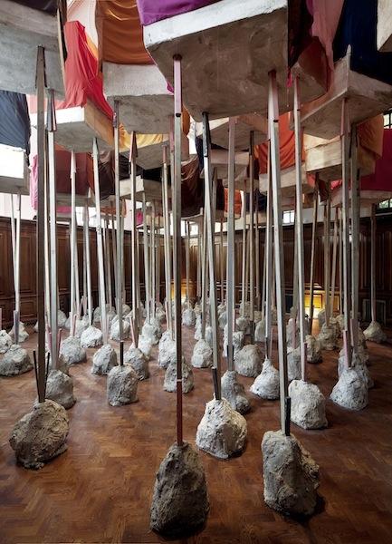 Dominating the main space is a forest of stilts planted in clumsy cement blobs and held steady with wooden wedges. Stuck precariously on top are what look like big concrete blocks, far too heavy for the flimsy supports. They hover just below the ceiling and from the mezzanine balcony, you get a good view across this sea of matter; the blocks have been draped in red, orange, maroon and blue dust covers that colour the ceiling with patches of reflected light.