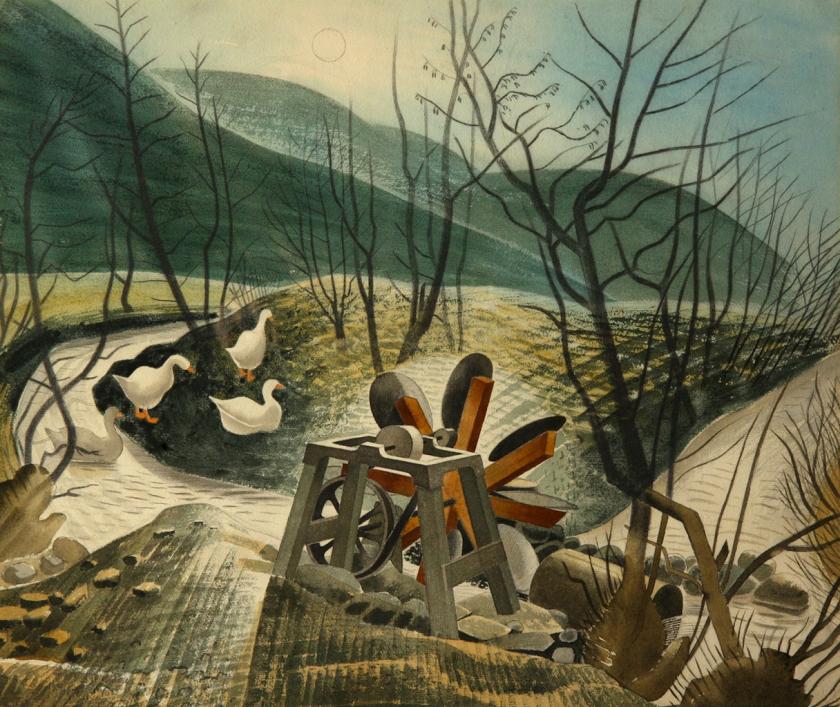 A characteristic Ravilious is inescapably distinctive, and, in its very English fashion, gently surreal. Thus, in The Waterwheel,1938 (main picture), the geese in the background are incongruously large in contrast to the piece of machinery closest to us. But it doesn’t matter in the least; it just reminds us how art so often lies to tell the truth.