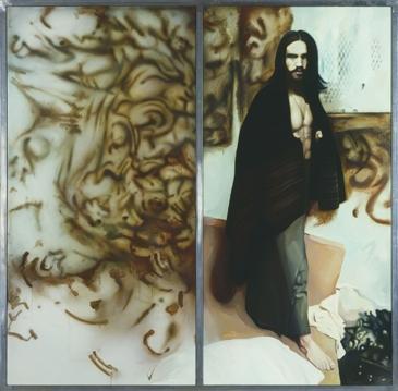 Take, for instance, his series of Northern Ireland paintings, the three large paintings, and their off-shoots, that come under the title of The Citizen (main picture above), The Subject and The State. These were produced over the course of a decade, beginning with The Citizen, a painting of IRA prisoner Bobby Sands, which Hamilton began shortly after Sand’s hunger-strike induced death in the Maze Prison. This diptych features one canvas daubed with swirls of brown paint, which can be appreciated as a bit of abstract expressionism, but of course refers to the period of "dirty protest" in the early Eighties when IRA prisoners draped themselves in blankets instead of wearing prison clothes, refused to wash, and smeared their excrement on to the walls of their cells. The other side features Sands himself, looking messianic: bare-footed, blanket-shawled, long-haired and bearded - Christ, but crossed with Charles Manson.