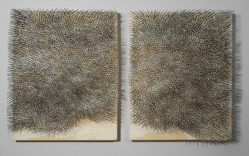 Wind, 2009, (main picture) on the other hand, is so dynamic it looks as though it might blow off the wall. Uecker has used larger, three-inch nails hammered in at different angles to achieve a semblance of motion. The heads of the nails are painted white but the stems are left dark, which makes the relief look as organic as a field of barley blowing in the wind. The presence of two panels rather than one creates an ongoing dialogue, while the shadows cast on the wall between them enliven this potentially inert space with spiky patterns. As a result everything seems to dance, spiral and spin.