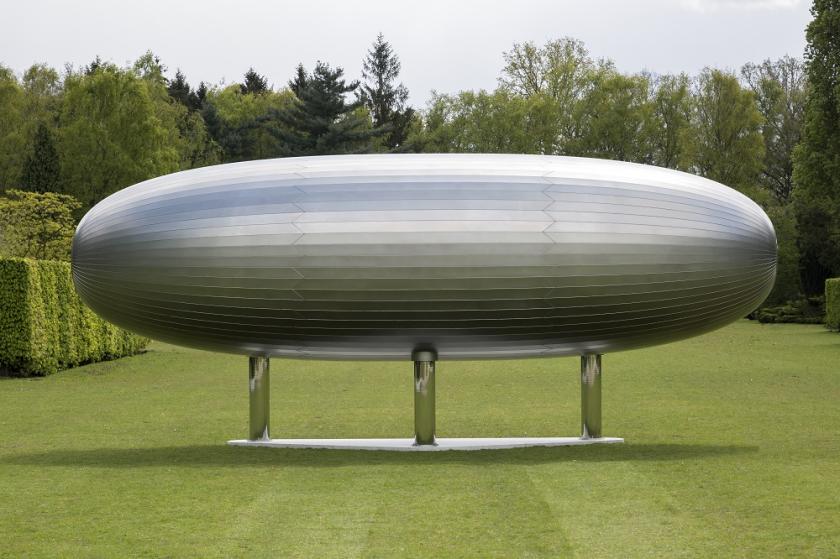 Something like a parked zeppelin sits on three mirrored legs on a museum lawn in Belgium. It’s a cigar-shaped steel fabrication that, were it to float free of its three legs, could also pass for a UFO. But given the context - a sculpture park outside Antwerp - we can rest easy. Never Mind is a work of art by Richard Deacon.