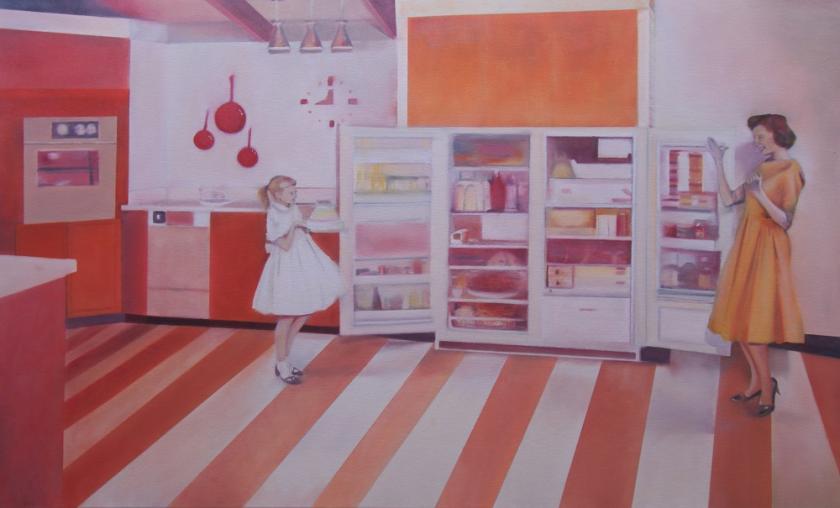 The painting I have selected for this show from my own work is The Perfect 50s Housewife, 2018 (main picture). It tells the story of the American housewife from a bygone era, who has bought a new fridge and stuffed it with food and drink. Her daughter stands there showing off her huge homemade cake whilst the mother mimes “Isn't it big!”. The fashionable scenes displayed in my work are populated but focus on the non-communication or separation of each figure from the other, creating a void of silence.