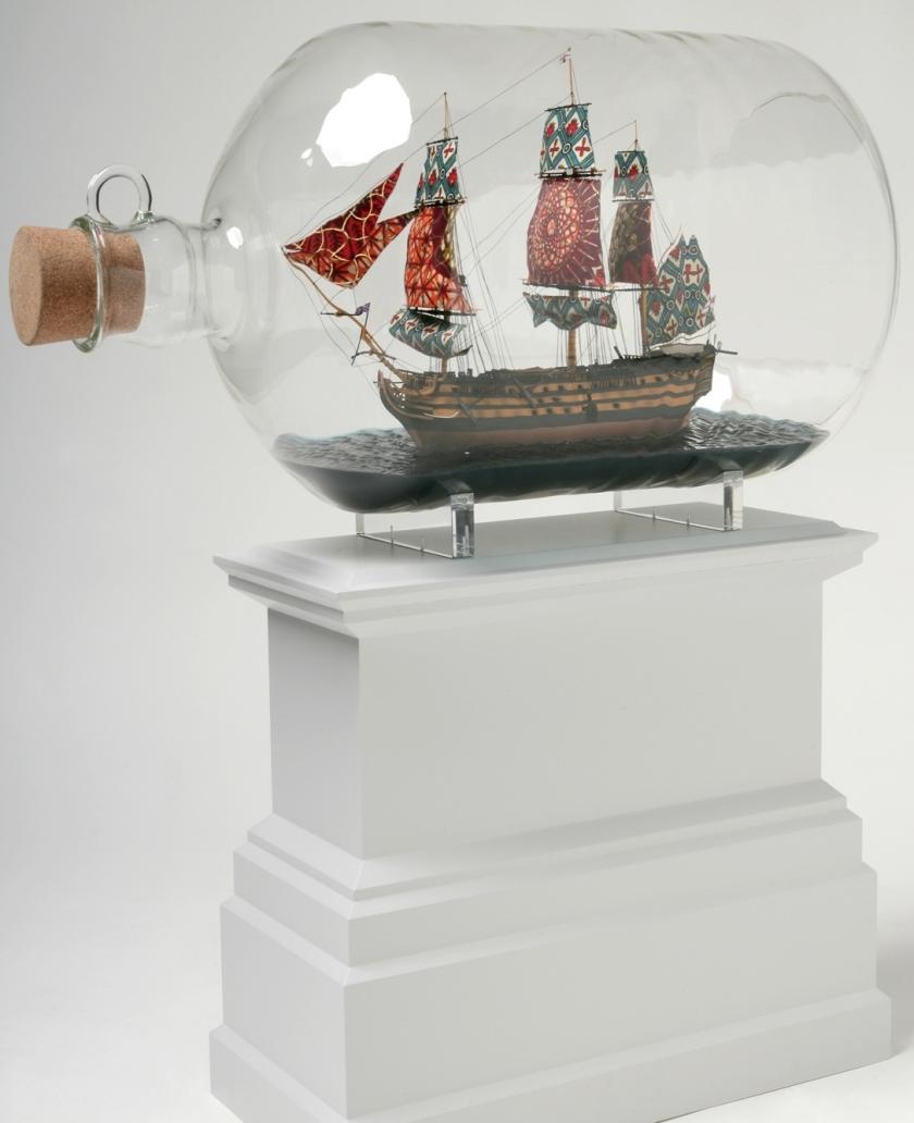 Shonibare has said he is keen to celebrate the complex cultural relationships that are the outcome of Nelson's legacy. The ship’s 37 sails are made of Shonibare’s signature material: highly decorative Dutch wax textile. The fabric may be associated with Africa but the patterns are in fact Indonesian-influenced and were produced by the Dutch for sale to the African market. Today, Shonibare buys it in bulk from Brixton market in south London.