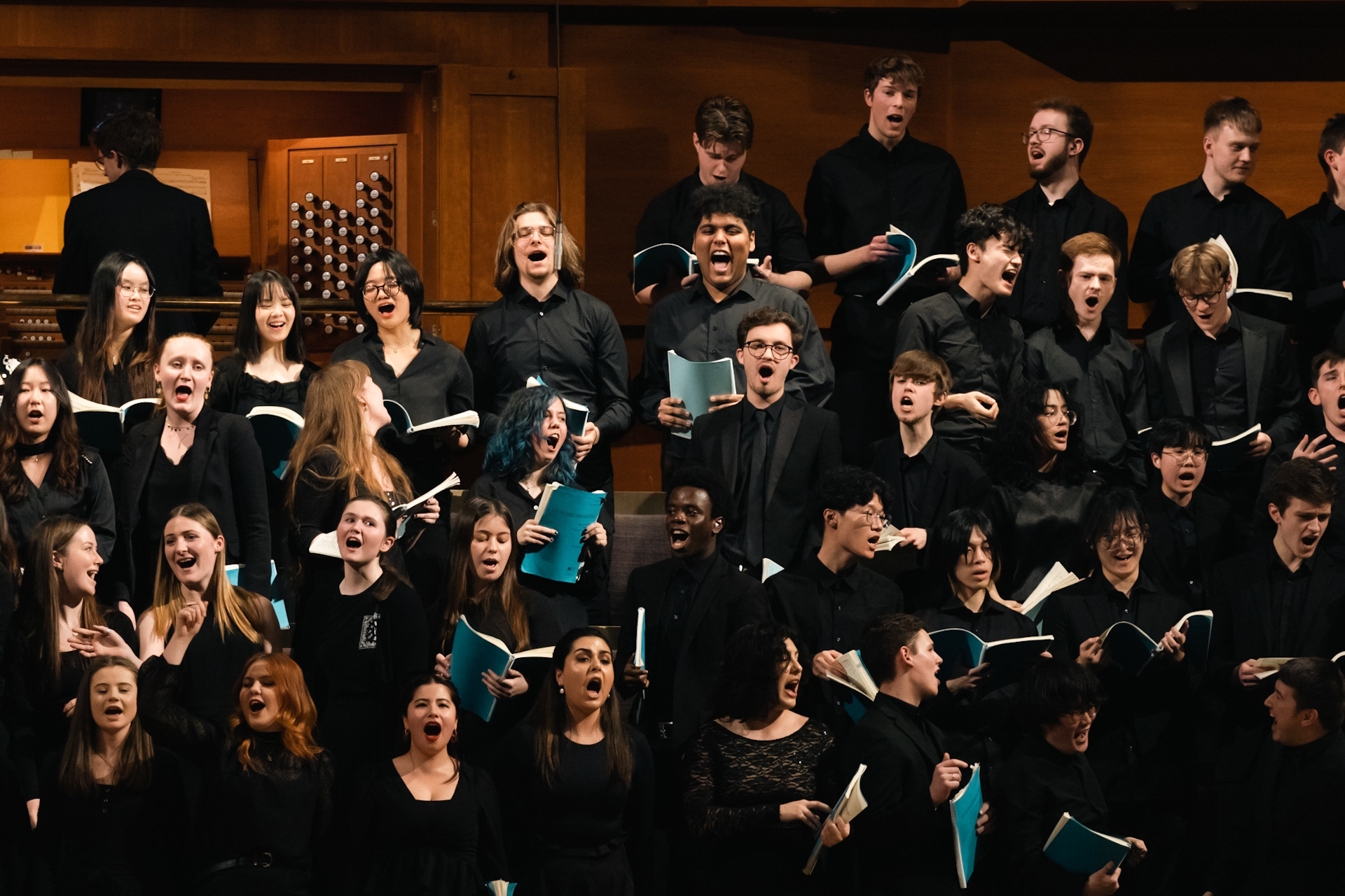 The RNCM Symphony Chorus and Chetham’s School of Music Choir had a lot of singing to do, and every note was strong: they could do their bit of clapping and whooping when required, too, and at the end, when they left their choir seats and joined their audience in the auditorium, their sound was magnificent.