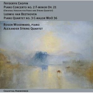 Chopin: Piano Concerto No 2 (version for piano and string quartet); Beethoven: Piano Quartet No 3 Roger Woodward (piano) with the Alexander String Quartet (Celestial Harmonies) Chopin’s own quartet arrangement of the F-Minor Concerto doesn’t sound like a diluted version of the orchestral version; what’s striking is how successfully Roger Woodward manages the tricky balance between piano and solo strings. If anything, the reduced tutti opening is more successful, with not a hint of muddiness or greyness. Woodward’s playing is as benignly effortless as always, without a trace of ego. The sublime Larghetto too gains from the extra transparency and the Allegro vivace swings and dances slyly. Only once did I forget that this is a chamber performance – surprised to hear the solo horn call chiming out on cello a few minutes from the close.
