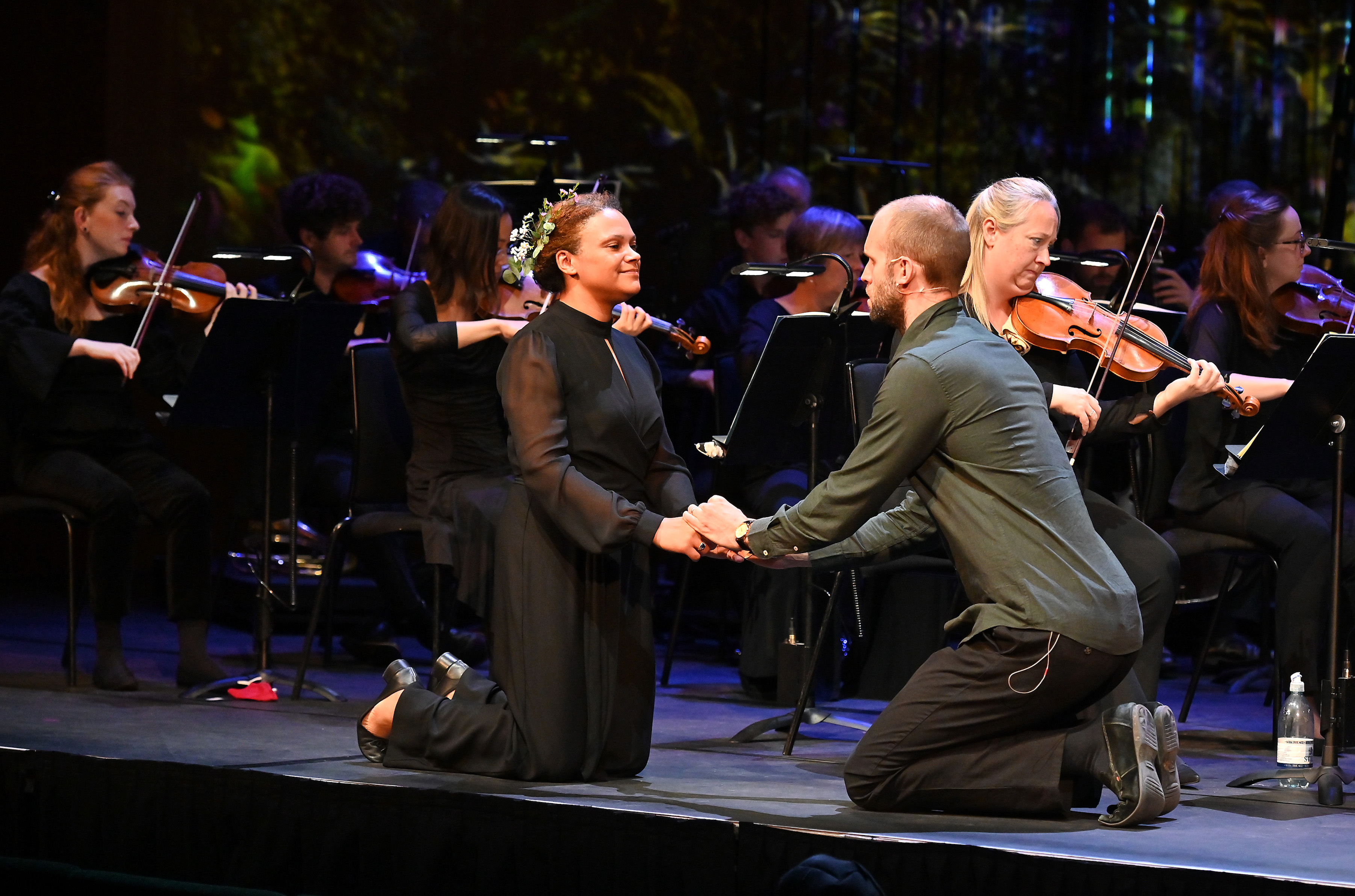This Creation came into being in English rather than German. The libretto, after all, was published bilingually in the first edition of 1800. Throughout the piece you can hear Haydn striving – and even managing – to best the musical coups he had admired in Handel’s English-language oratorios in London. On top of his first-class players and chorus, and the accomplished solo voices, Cummings had extra help on the way to paradise in the form of the video projections by Nina Dunn Studio. They surrounded the stage in an ever-changing swirl of digital effects. All that virtuoso hi-tech wallpaper – video-designed by Matt Brown – introduced a risk of sensory overload in a work already full of mimetic and descriptive writing that gives a musical colouring to every kind of entity from worms to flowers to stars. Sometimes the projections brought genuine magic to the mix. As the universe emerged from chaos after Haydn’s revolutionary orchestral depiction of a pre-creation void, the deep-space, Big-Bang patterns of the backdrops worked their cosmic charm as exploding nebulae spun around the stage. I did worry that, as God created flowers, trees, fishes, birds, beasts and finally Adam and Eve, the visuals might turn too literal and David Attenborough-ish. Luckily, Brown didn’t stray too far down that figurative path. We saw some identifiable blooms, including an apt strelitzia, or bird-of-paradise flower (pictured above with Mary Bevan), but otherwise semi-abstract patterns suggested a constantly mutating landscape of oceans, forests and meadows. At the moments of high drama that punctuate Creation, as when light illuminates the darkness in a blaze of sound, bold and simple images – a sun, a moon, an eye – did their complementary work. Were there stretches when this seething, fractal, optical busy-ness proved too much of a clever thing? Certainly. Did it seriously interfere with our enjoyment of the artistry on display from singers, chorus and musicians? I doubt it.