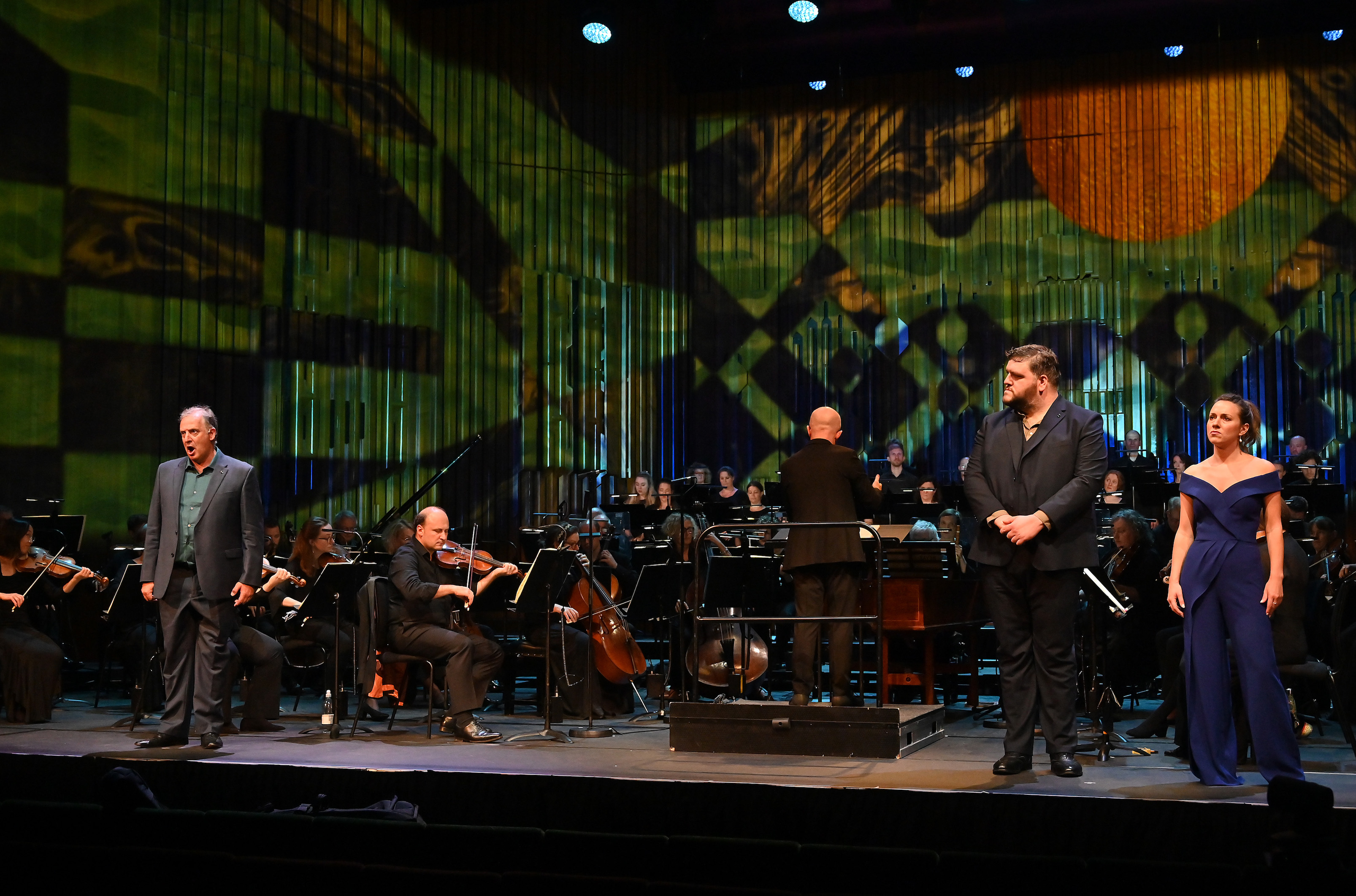 As for the three angelic soloists in the first two parts, they avoided oratorio stiffness by a measure of mobility. They flung their recitatives from the back of the stage but moved forward to the front for their arias. Stuart Jackson’s Uriel made a genial, urbane but formidable tenor linchpin, mighty but never rough in the flowing lines of his narration. This voice is an absolute rock, but a friendly rather than jagged one. When the sun first rose in its aural and (in this production) visual glory, he more than held his own. Matthew Brook’s Raphael captured the curious mix of lyricism, wonder and drollery in Haydn’s settings of the Genesis stories. His soaring, rhapsodic passages of awe yield to stretches of almost-comic patter as the sheer oddity of God’s handiwork – slitherers, waddlers, creepy-crawlies and all – finds musical shape. It’s not often you hear audience belly-laughs in a canonical masterpiece like this, but Brook got them when he showed how “in long dimension creeps with sinuous trace the worm”. Mary Bevan’s Gabriel, meanwhile, sailed elegantly through the coloratura passages that give expression to the new-minted wonders of nature (“With verdure clad the fields appear”). She sounded aptly airborne and feathery as the creation of the birds (“On mighty pens uplifted”) inspires some of Haydn’s sweetest pastoral styling. The AAM’s players chipped in with the cute or cumbrous mimicry of fish, flesh and fowl that Haydn gives to flute, horn, clarinet, trombone, and so on. Cummings kept his tempi lively (as did Haydn, it appears) and drew some thrillingly tight and fierce choruses from the choir behind. This Creation glinted and shone in a bracingly clear light. God (and Haydn) did not say, “Let there be sludge!” The roof-raising exchange of praise between chorus and the trio of soloists (“Achieved is the glorious work”) out-Handels even Messiah in hands, and voices, as sure and well-managed as these (pictured above: Matthew Brook, Stuart Jackson, Mary Bevan).