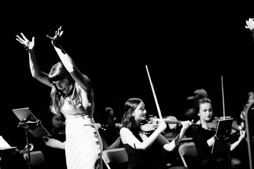 Comedian and composer Vikki Stone – trained at London’s Royal Academy, and a respected purveyor of comedy songs (as well as presenter of the BBC Proms podcasts) – is nothing if not ambitious in her Concerto for Comedian and Orchestra, which was given a one-off Fringe performance with the crack young musicians of the National Youth Orchestra of Scotland Camerata (pictured below, with Vikki Stone), following performances at the Glastonbury and Latitude festivals. It’s a full-scale, hour-long piece and, as its name suggests, brings together stand-up storyteller and classical ensemble, across several movements that play wittily with classical conventions – whether we’re allowed to clap between them; a slow movement on a slow subject; even the addition of a movement 1a to accompany the arrival of those pesky latecomers.