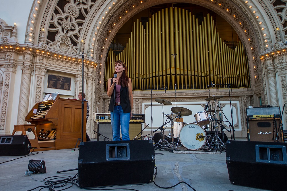 Being San Diego Civic Organist with the trust and freedom the City of San Diego gave me opened the chance to really explore all avenues of music in my performances. I paid attention to the news; if some famous artist passed away I would do my very best to play a tribute to them. The week that David Bowie passed, Kerry, also a drummer, agreed that we would do a medley in his honour. This was well publicized for a Sunday concert and we had a record turnout for that event. From that concert came the idea to form the Carol Williams Band (pictured below by Robert Lang) which was very well received. The Society realized that donations were at their highest levels with an audience record of 7,000 for a Rock 'n Roll concert. My innovative approach continues to this day.