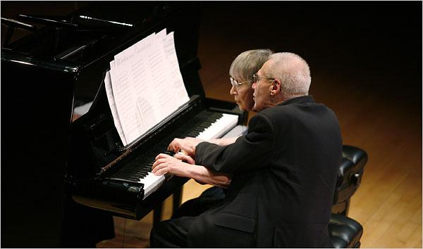A selection of György's solo and duet music – including several jewel-like pieces from his celebrated pedagogical series Játékok (Games) of 1973 – were interspersed with music by Bach, rearranged by György for four hands. They took turns at the piano solos, Márta, the professional pianist, mostly watching over György, at times immersed, at times blushing with adoration, at times resembling a backseat driver, desperate to correct him.