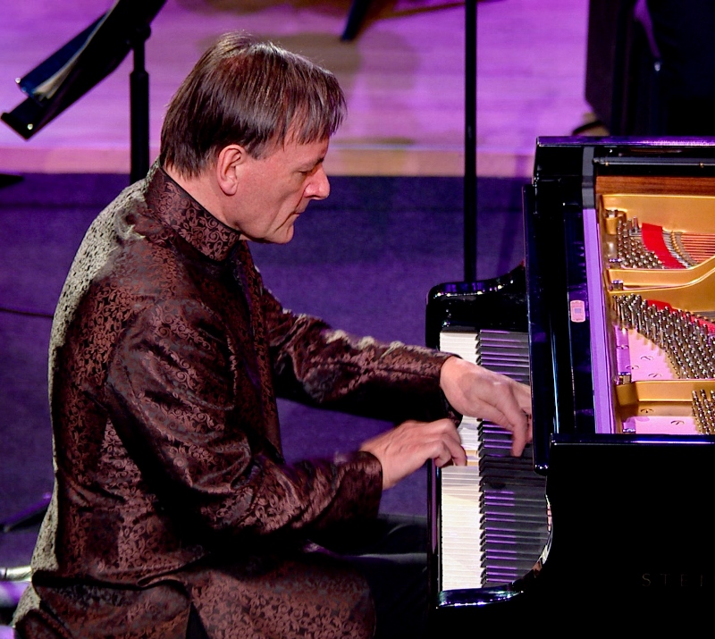 Our soloist this time is Stephen Hough (pictured left), who’s recorded all Rachmaninov’s concertos, and the filming by Maestro Broadcasting Limited (with sound by Steve Portnoi) captures his star quality, too, zooming frequently in on his face, his piano and his fingers. The partnership with Elder seems made in heaven, the music rhythmically alive, light-hearted until Variation Seven, changing instantly to wistfulness and questioning, and then grimmer as the “Dies Irae” quotations obtrude. Variation 12 is beautifully poised, and conductor and soloist work up a tantalising approach to the big tune of Variation 18 (which Hough plays ecstatically), before the charge to the end.