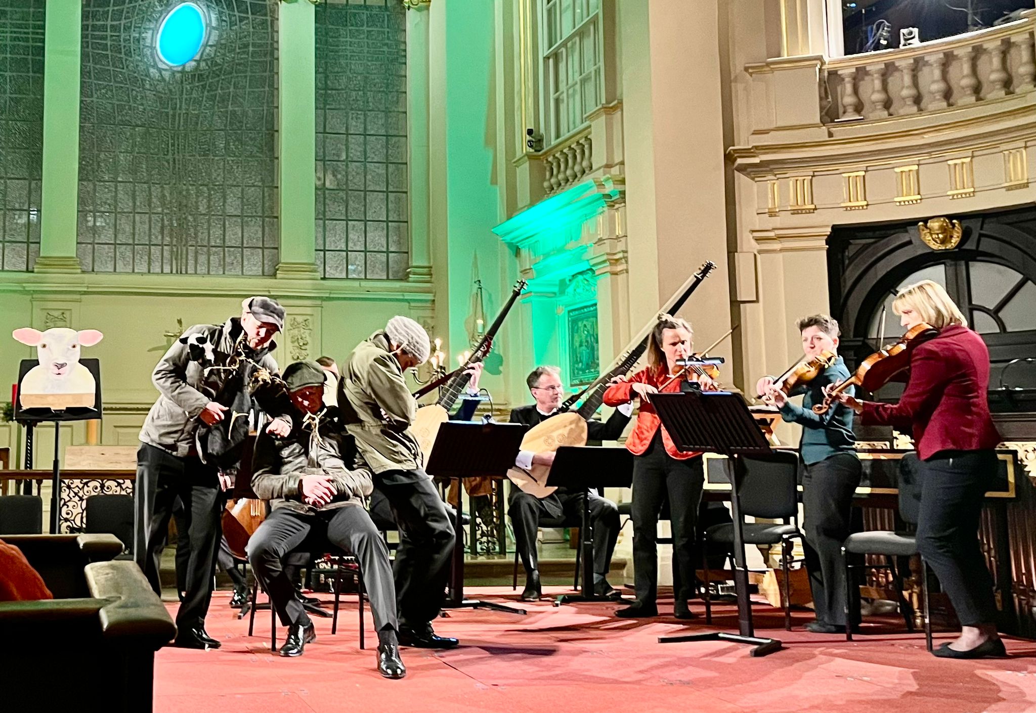 Our plum pudding came in the shape of Caresana’s jovial La Tarantella from 1673: a dance-driven Nativity romp of dozy shepherds, slinky angels and comically inept devils composed by a maestro of the Capella Real in Spanish-ruled Naples. Pointy glowing horns (Charles Gibbs’s magnificently villainous Lucifer and his infernal sidekicks, pictured above), glittery headgear (the flirtily angelic Rebecca Lea and Ana Beard-Fernandez), straw for the sleepy, anorak-clad pastori (pictured below), and even a cut-out sheep, all added to the fun, although Hollingworth’s bold claims for the score seem a little on the generous side. (Maybe unwisely, he prefaced the cantata with a snatch of the rustic pifa interlude from Messiah itself).