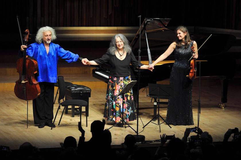 The alchemy of music-making is a funny thing. Decades of friendship and collaboration connect Argerich and Maisky, and yet musically they are completely different beasts. Argerich’s flames burn white-cool and close, while Maisky’s lick and sprawl with profligate, generous heat, sending sparks tumbling each time he draws his bow. It’s a contrast that flourished in Mendelssohn’s impetuous Trio No. 1 in D minor, and found common ground in Shostakovich’s Piano Trio No. 2 in E minor, but which contested the territory of the Beethoven.