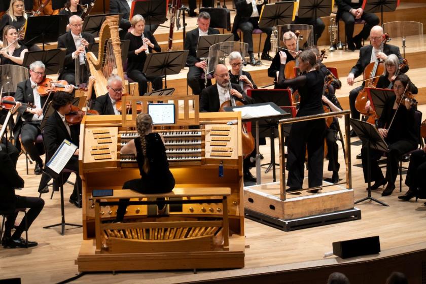 Touch of humour: Anna Lapwood at the organ console with the Hallé conducted by Katharina Wincor