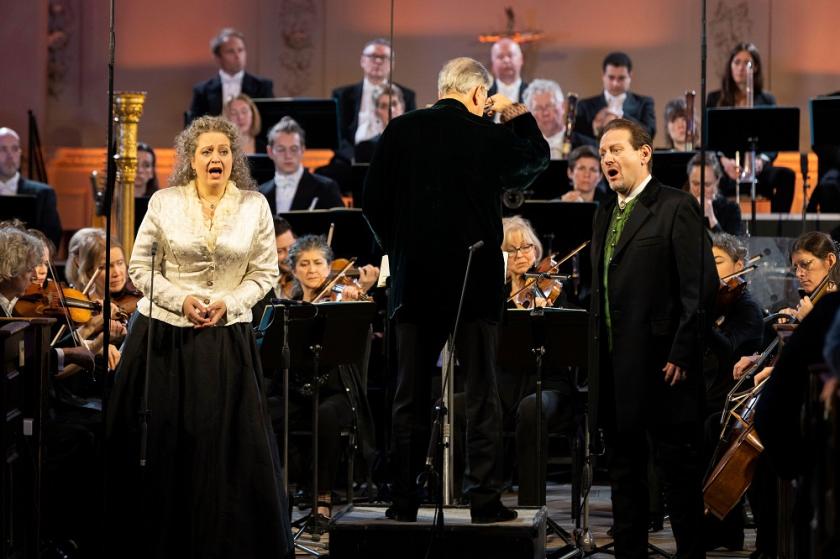 Perfectly modulated perfection also came from the Monteverdi Choir, running the gamut from tenderest of shepherds to harsh, spitting Egyptians. The same was true of Michael Spyres’ Narrator (pictured above with Gardiner), using the full palette of colours from baritonal range to tenor heights: thrilling and involving from the very first declamation of the evening. There’s also no doubt that young William Thomas is next in line for “great British bass” status; Herod’s aria resounded with perfect phrasing and tone. And the final, simple-seeming chorus, approached via a Berlioz minimalism of single unison notes which Gardiner caught to perfection was gilded with the seraphic tones of the Trinity Boys’ Choir from the gallery at the west end. You don’t get more spiritual seasonal music, with the exception of parts of Bach’s Christmas Oratorio, than this, nor classier performances.
