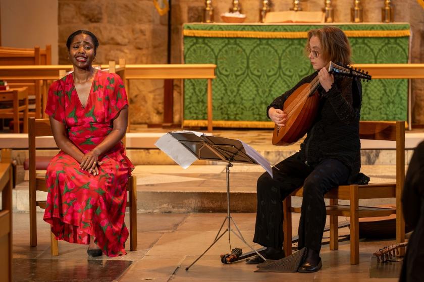 On the way to the Tower I’d been reading the chapter in Antonio Pappano’s marvellous autobiography where he writes about coaching young artists and declares, “I am merciless that the eyes of the singer are a feature of their presentation”. Williams has marvellous eyes, and is a born communicator, yet such is the layout of atmospheric St Peter ad Vincula, bright in the early evening light, that probably not as much as a quarter of the audience would have witnessed the full deal other than in the four dramatic songs, where she rose from her seat beside Kenny to enthral us all (pictured below).By the late stage at which the first of them arrived, I’d been standing against a pillar at the back of the church for the first two sequences. Terraced seating might not have been an option in the venue, but why did no one think of a raised platform on which to seat soprano and lutenist?