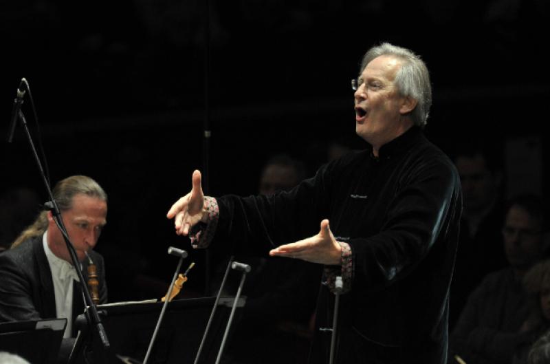 Which I’d never say of Gardiner’s Bach. The Monteverdi Choir and English Baroque Soloists capped by three refined trumpeters had so much to celebrate and dance about in the outer portions of the Easter and Ascension Oratorios – which they did with relish of every accent, every unexpected turn of phrase or modulation. Anticipating the always unorthodox combinations of instruments in Bach's more intimate moments, I melted at Michael Niesemann’s oboe over sighing strings in the unusual slow section to the Easter Oratorio's opening Sinfonia (Niesemann to Gardiner's right at the Bach Marathon earlier this year below) and to Rachel Beckett's flute for the long soprano aria.