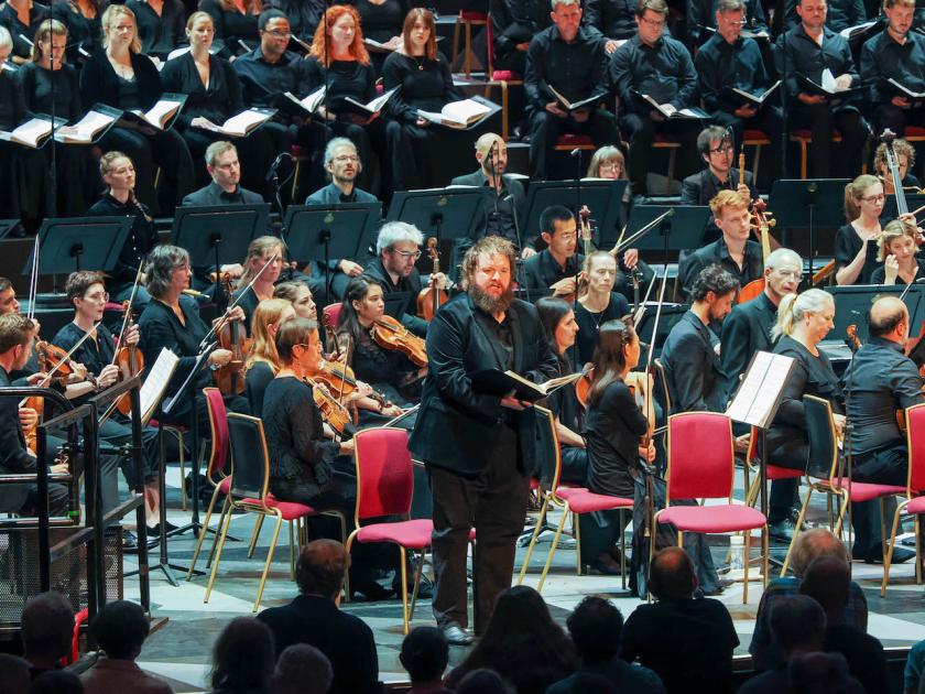 The musical drama of the opening is propelled by the contrast between Samson’s wretchedness and the festive exuberance of his captors, the Philistines. In the first of her dazzling appearances in multiple roles, the American soprano Joélle Harvey’s voice effortlessly took flight across the auditorium as she summoned the men of Gaza to bring “The merry pipe and pleasing string” (pictured below right). By contrast, as Samson’s confidante, Micah, contralto Jess Dandy brought pathos to the action with a voice that was as rich as it was full of shadow. In a quietly resonant ending to the first act, Clay’s carefully nuanced delivery of the “Total eclipse!” aria was heightened by the beautifully sustained emotion of the Philharmonia Chorus’s response as the Israelites invoking God’s gift of light to the world.