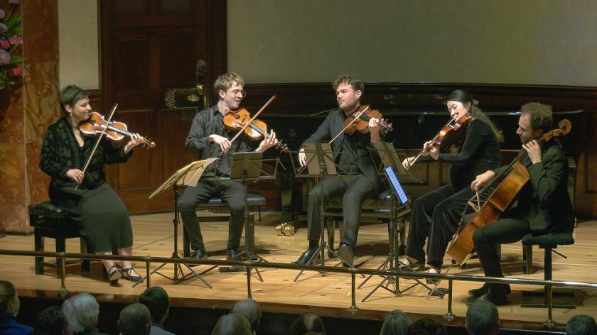 Viola for clarinet gives us a completely different experience in Brahms's Op.115: while several clarinettists in recent performances have taken the Quintet out of the "autumnal" category, the beautifully blended sound of five strings dialoguing intimately with each other restored that (both approaches are valid). Ridout took up what would normally be the first violin's place (pictured above), frequently soaring above Włoszczowska; their teamwork was magical throughout. The one place where the originally intended instrument might be missed is at the heart of the slow movement, where the agitated flurries still work better, I think, on clarinet. But this flowing third movement was peerless, and the dark colours of the finale once again benefitted from such intensive working-together. No wonder so many younger-generation musicians were in the audience, giving it a different atmosphere from the Wigmore usual.