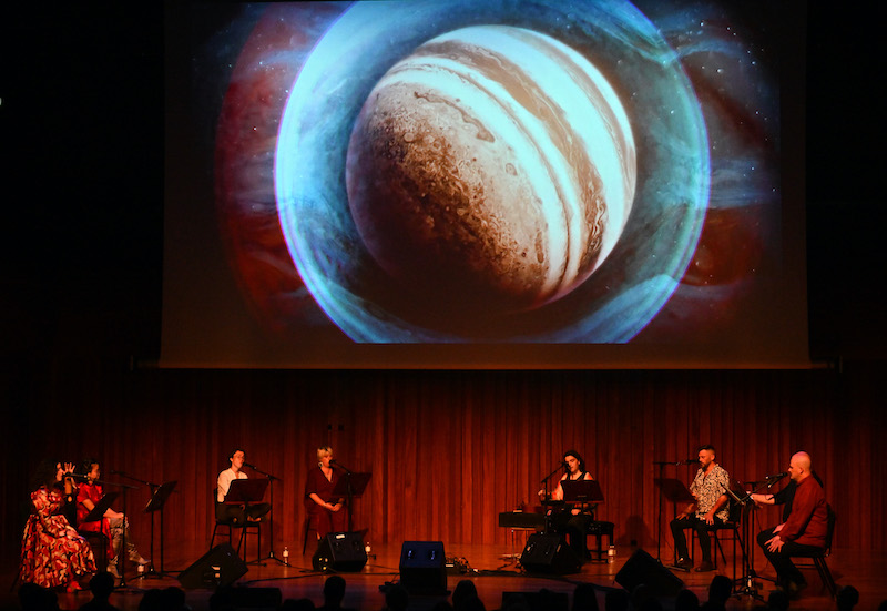 Stillness was also the watchword for Alev Lenz’s spacious 7 planets, which made up the entire second half (pictured above). In this, each of the planets of the solar system (like Holst, omitting Earth) had a meditation that reminded me of the drone music of LaMonte Young or the choral music of John Cage, or the rich vocal textures of Björk’s Medúlla. It was hypnotic, held together by tuning-forks, pitched to planet-related in-between notes, beaten with the insistent warmth of Buddhist temple gongs. Hocketing motifs floated here and there over unchanging bass pedal-notes, all accompanied by visual depictions of the planets on a big screen, which I found disappointingly literal. Composer Alev Lenz also sang an encore with the group, a piece she wrote for the Netflix series Black Mirror, a startlingly beautiful tapestry of overtone singing and generous reverb, with a haunting melody floated above.