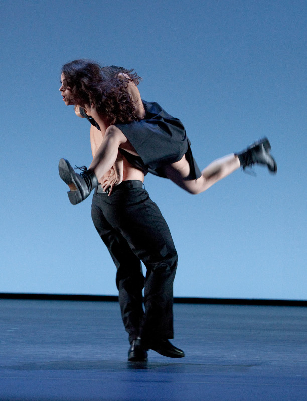 Mahler's Seventh Symphony is supposedly the difficult, enigmatic, hard-to-like one, but Schläpfer's visualisation of it in Seven (2013) embraces and makes a virtue of that difficulty, revealing it as a vibrant richness, full of surprises. The switches of mood, the interruptions to themes, the unexpected instrumentalisation in Mahler all find visual echoes: you never know whether dancers will be in pointe shoes, soft shoes or jackboots (pictured right), or which members of a group or a trio are going to go off with one another, or whether a romantic relationship is about to turn sour or a violent relationship sweet. Schläpfer will jar us one minute with cacophonous stamping which drowns out an oboe solo (sacrilege!) and then delight us the next with tableaux of great beauty and elevation: a woman lifted and floating like an angel, or four friends embracing, or a little group "rowing" on their backsides (a nod to Pina Bausch, surely).