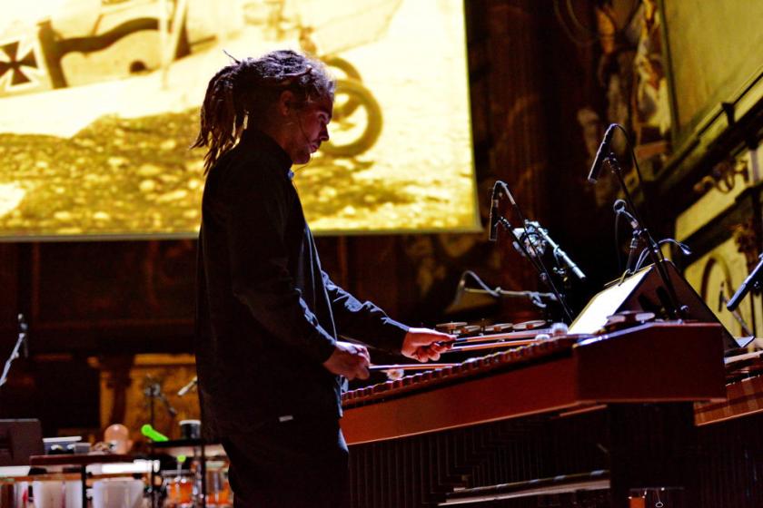 Later on Saturday evening, in Glasgow’s Tramway – where the Turner Prize nominees are themselves blurring boundaries between sound and vision – Belgian composer Eric Sleichim and percussion quartet Bl!ndman produced a spellbinding accompaniment to the 1927 silent movie Wings, a sentimental if visually spectacular tale of flying aces in the First World War. Bookending their score with samples of Hollywood movie soundtracks, the five players mixed percussion music by Cage, Xenakis, Reich, Stockhausen and many more in a provocative new soundtrack – at times it was carefully matched to the images, at others it went wilfully against them, and often it seemed to ignore them entirely, an effect emphasised by the stage lighting that at times turned the event into a percussion concert that happened to have a movie playing in the background.