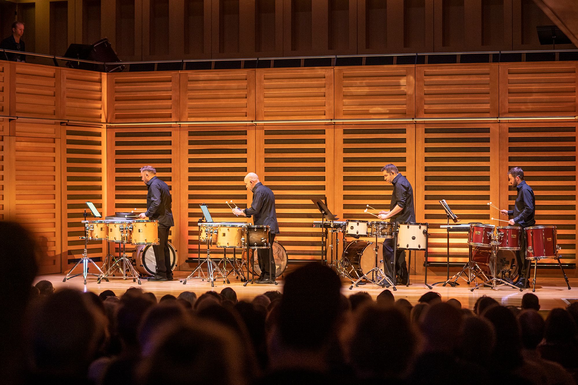 Following this, we were ushered into Hall One, where the Colin Currie Quartet (pictured below) demonstrated that you don’t need to rely on technology to get 360-degree sound. In the opening number for wooden frame drums, John Luther Adams’ Qilyaun, the performers stood at all four corners of the auditorium balcony, sending out waves of unruly noise through rolling crescendos and decrescendos. The piece was inspired by the culture of the Iñupiat people of northeast Alaska – at times it felt as if we were caught in a storm swirling round a vast open landscape, while at others a more synchronised regular beat filled the room with a sense of ritual.