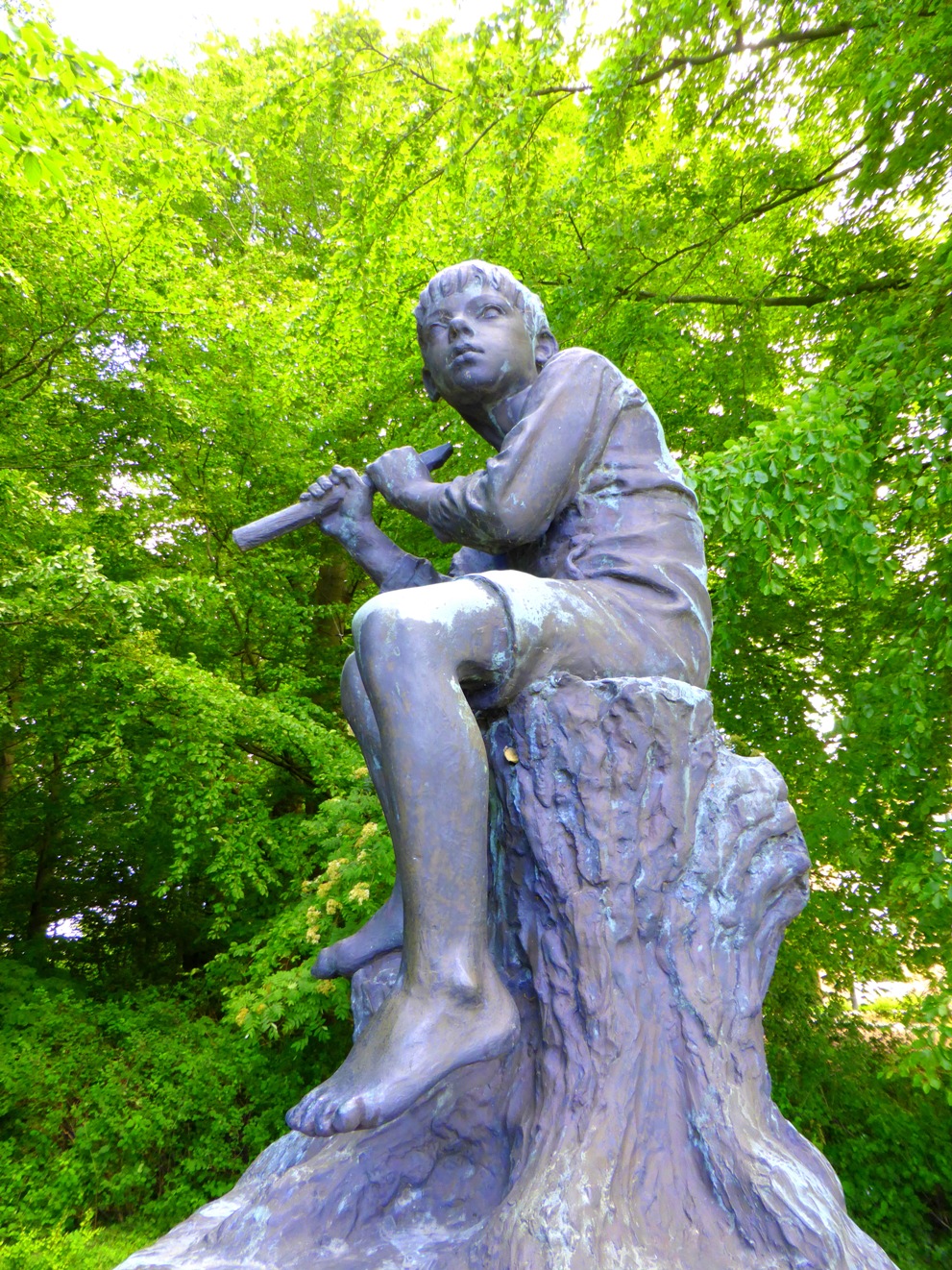 Nielsen’s childhood home is beautifully kept, with jugs and vases of wild flowers on the windowsills just as Nielsen recalls his mother arranging, and plentiful objects to complement the rich display in Odense’s Carl Nielsen Museum adjoining the concert hall (a new theatre and opera house is under construction alongside, due to open in 2017 with a cycle of Wagner’s Ring operas). As its curator, singer and Nielsen lover Ida-Marie Vorre, pointed out, it should really be called the Carl and Anne Marie Nielsen Museum, for this beautiful display is equally a homage to Anne Marie’s talent as a sculptor, with plenty of her models and smaller sculptures (pictured above, Anne Marie working on a copy of the Parthenon hydra in Athens during 1903 while Nielsen sits). What a remarkable woman, one of the prime candidates for a Wives of the Great Composers study (others with careers tend to be sopranos, like Pauline Strauss and Nina Grieg). There are two statues she made imagining her husband as a boy, herding geese and cows, in the meanwhile fashioning a pipe from a willow switch. The one pictured below is on the busy road to Nørre-Lyndelse.