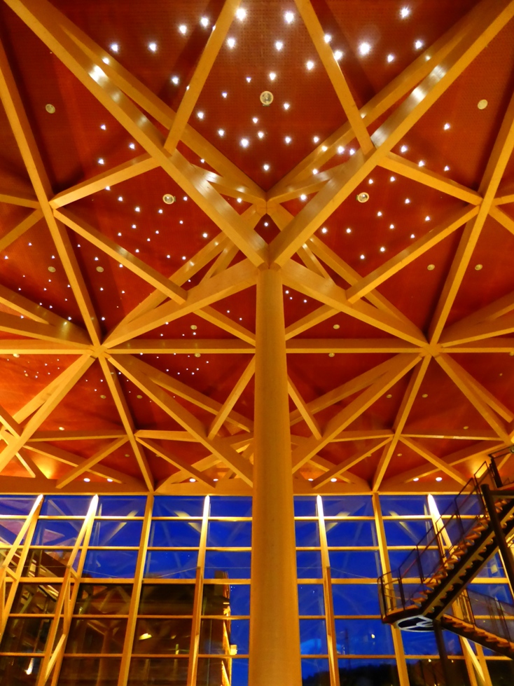 The pillars and roof inside emulate a pine forest. Nine tapered spruce “trunks” support geometrically arranged “branches” which in turn support the roof, the spaces in between a “night sky” with fibre optic cables representing the alignment of the night sky on the day of Sibelius’s birth (pictured below).