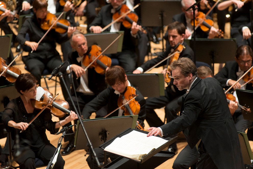 JONATHAN NOTT: Well, there’s quite an interesting story behind that. I fought tooth and nail over it, because that was done quite a long time ago, we’ve got a different stage set-up now, and the acoustic has changed. I’ve always wanted to do something with the original podium, which was a pentagon. That made a very big distance between the front and the first risers where we have the winds. We had Toyota come to try and improve it. I mean, a piece like tonight’s Alpensinfonie is just a bit too big for this hall, and I can’t always do anything about it. And the strings make a lovely sound in the hall, but the sound goes sideways and develops whereas the wind comes straight at you and it always feels as if they’re much too loud for the strings. After various improvements, I said we should do the Sixth again, and we fought about it and agreed about it and then disagreed, so in the end the old one did come out.