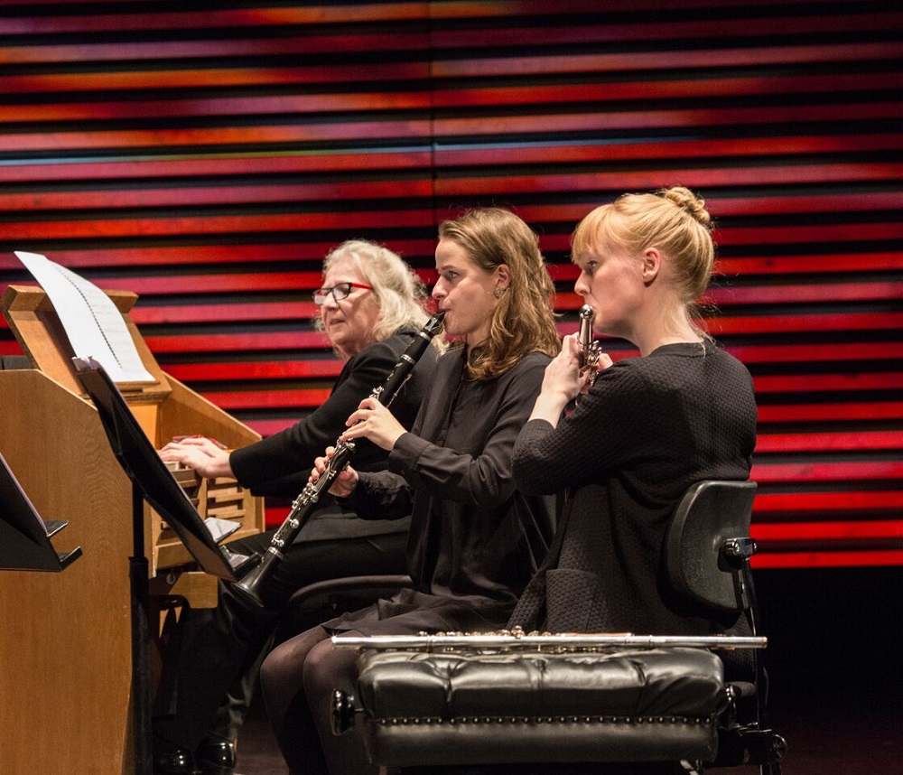 If only I could have been in Reykjavík for the full four days of the festival – more Messiaen birdsong called in Aldeburgh, a once in a lifetime chance – I would no doubt have got to know the players better. Ólafsson had spanned the decades in his choices of performers. The youngest, generously championed, was multi-talented Bjarni Frímann Bjarnason, whose piano-playing and conducting we witnessed, but not his skill on the viola nor his composing. The oldest had to be Ólafsson’s teacher at the Juilliard School, 84-year-old Jerome Lowenthal, a disciple of Alfred Cortot among others. He came with his partner Ursula Oppens (pictured above at the harmonium with Arngunnur Árnadóttir and Melkorka Ólafsdóttir), whom I remember playing the Elliott Carter Piano Concerto in Edinburgh in the 1980s.