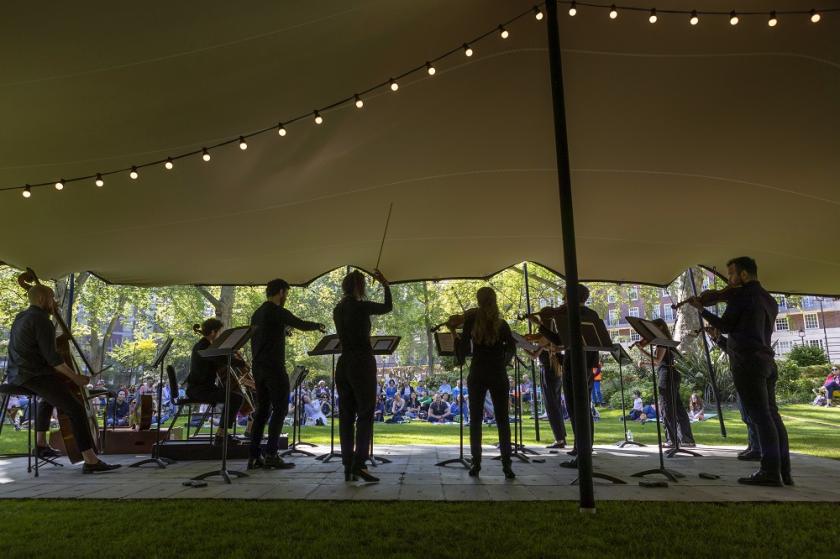 The beauty of outdoor events is that you can make your choice to focus or not: anything goes. The first part of the programme from the Beaten Track trio - Alice Angliss, Rosie Bergonzi and Beth Higham-Edwards - I heard, or overheard, from a seat at a table right at the back: the thud of tennis balls on the court right behind me asynchronous with the more regular beat from the tent, building works, birds, church bells at the quarter-hour, the occasional revving of motor bikes (Portman Square is big, but traffic-surrounded), children shrieking in the playground. It was wise not to amplify the players, but each of the three players introducing the pieces could have done with a hand-held mike (not allowed this time; there will be one on the next occasion). Short works by Andy Akiho and Takumi Motokawa blended beguilingly into the surroundings.