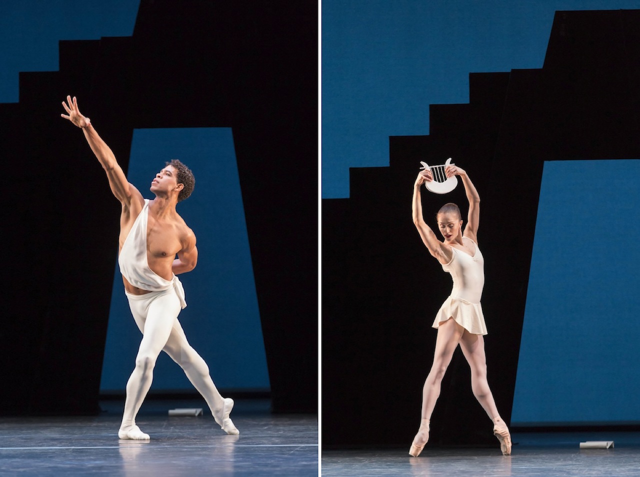 Acosta treats the sun metaphor (which Apollo, the god of sun and art, embodies) as the warmth on his back, the light on his face. He thrusts his hands into the air palms up, collecting sunshine, beaming his elemental force back to us with wonderful, almost jazzy sensuousness. It’s a terrific way to be Apollo - nothing grandiose or po-faced about this god, just heat, power and sex. (Below, Acosta as Apollo, Nuñez as Terpsichore)