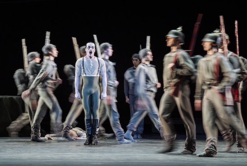Wild expressionist imagery presents Woyzeck’s hallucinations as he experiences them: nightmares of squad-bashing and an apoplectic Captain (Thomas Whitehead, pictured above), the conviction that everyone he knows is mocking him; the conviction that his woman Marie is really in love with the priapic Drum Major; worst of all, that he is losing his mind. Music by Webern and Schönberg supports this catalogue of mental torture. At the end, as Schönberg's Transfigured Night winds to its surprisingly serene close, it's left for us to decide whether there is a chance of redemption for Woyzeck. On opening night Marcelino Sambé danced him as if his own life depended on it. He had even developed a special hunched walk, a depressed and self-protective hobble, that spoke volumes even when his back was turned to us. It was moving beyond words.