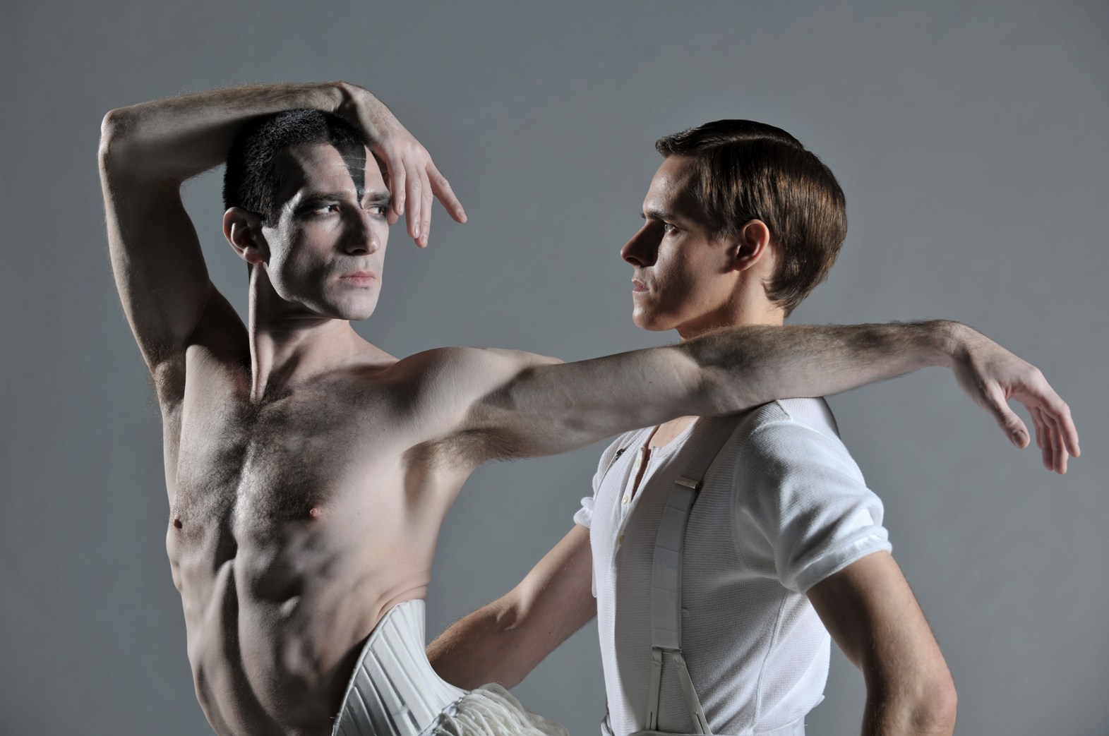 Namely those two-thirds feral, one-third human swans, as energetic as ever in this fine-tuned revival. Jonathan Ollivier’s leader towers in relation to his entourage as a prima ballerina like Svetlana Zakharova, all exquisite long arms (Meazza has those, too) and aristocratic grace, has long done at the Mariinsky and the Bolshoi. Dominating the sweet, troubled prince of Simon Williams – who’s also danced the Swan – Ollivier (pictured below with Sam Archer's Prince by Hugo Glendinning) mesmerizes with his rapid head movements and elongated profile. The great Pas de Deux still moves me: how astonished Tchaikovsky would have been to see a love duet between two men, and how much more than ever he needs help now. As the Act Three Stranger – read Odile the Black Swan – Ollivier is perhaps strip-cartoon sexy where Adam Cooper was stylishly menacing, but here’s a major presence and a powerful dancer, no doubt.
