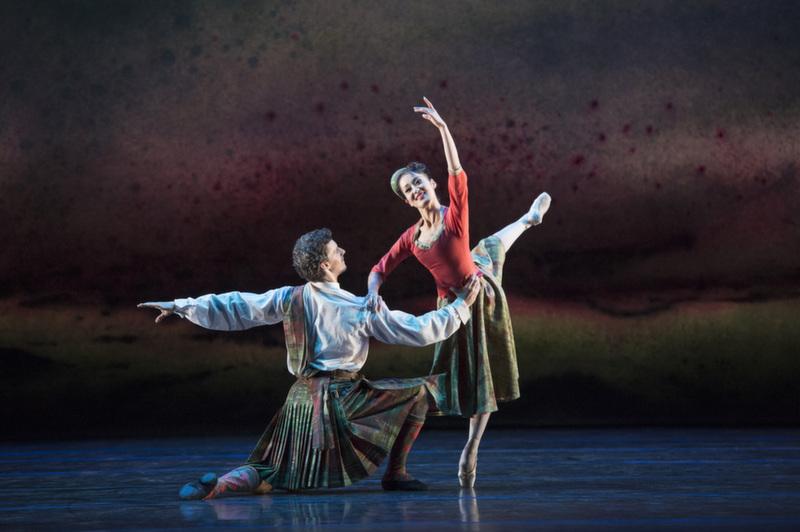 David Bintley’s 1985 Flowers of the Forest is, like La Fin du Jour, a work that skirts around war, suggesting it through absence, the pit of despair we hide under cheerfulness. Arancha Baselga, Tzu-chao Choi, Kit Holder and Maureya Lebowitz sparkle through its charming opening numbers, set to Malcolm Arnold’s easy-listening Scottish Dances, and the darkening of the tone takes you almost by surprise, as Arnold gives way to Britten’s 1940 Scottish Ballad. Half a dozen men whirling in generous kilts recall the “flowers of the forest”, the idealised generation of fine, lovely youngsters in their prime cut down in war (any war). Jon Goodwin’s painted backcloth is a marvel, abstractly purple and drab like the Scottish hills, its surprising depth of colour picked out by Peter Teigen’s lighting to give quite different effects. In that it is much more harmonious than the piece itself, which though often lovely, in my view suffers irrescuably from the contrast between its two pieces of music, and two moods.