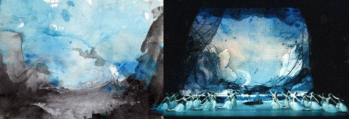 All Lamb needs to become a fine Swan Queen is to evoke the hugeness of the soulscape in this ballet. A more lyrically abandoned conductor might come in handy other than Valery Ovsyanikov, who allowed some very gruff brass-playing to go on and thudded through some of the more painterly parts of the music as if to cancel out Sonnabend's watery fancies. (Pictured below, her Act Four backcloth design on the page and on the stage.)