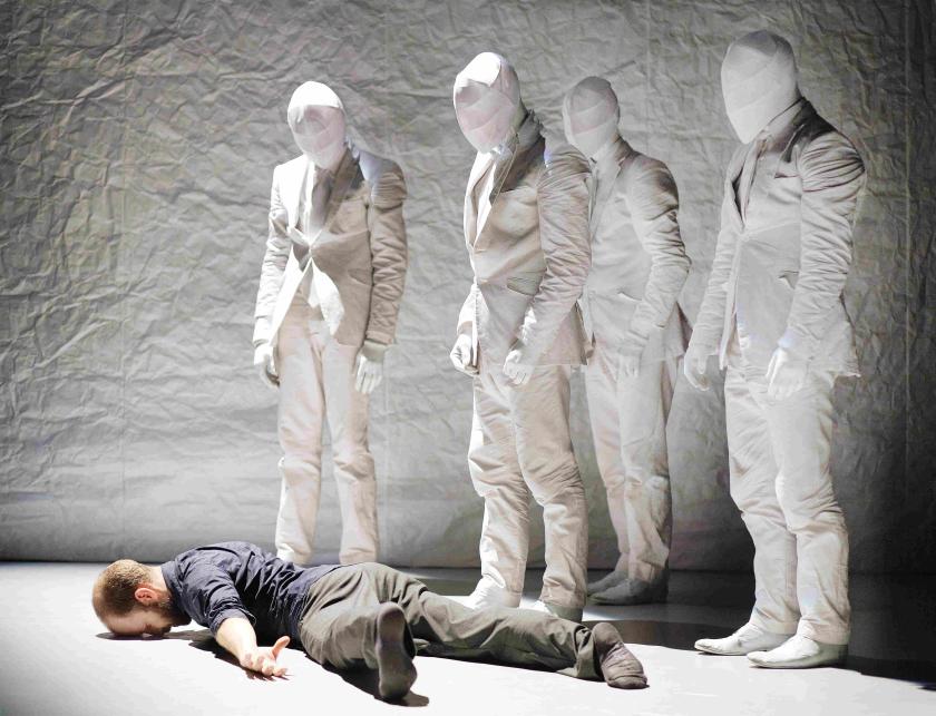 This is theatrical gold, and for the next thirty minutes it doesn’t let up. The story of The Tempest is told through a combination of dance, mime, and video, in which every character except Prospero is wrapped entirely in white. Wearing faceted masks of an ingeniously human-yet-alien shape,(pictured right and top) they resemble plaster-of-Paris mannequins brought to life and Pite has given them a movement language that builds on this half-strange, half-familiar quality: sometimes swift like animals, sometimes stiff like robots, sometimes mannered and artificial, sometimes impusively naturalistic, they are always something more and something less than human. A playful wit bubbles in clever touches, like the very visible string that pulls a model island back across the stage it has just traversed or the manic ninety-second jive with disco ball lighting into which Miranda and Ferdinand break once they are married.