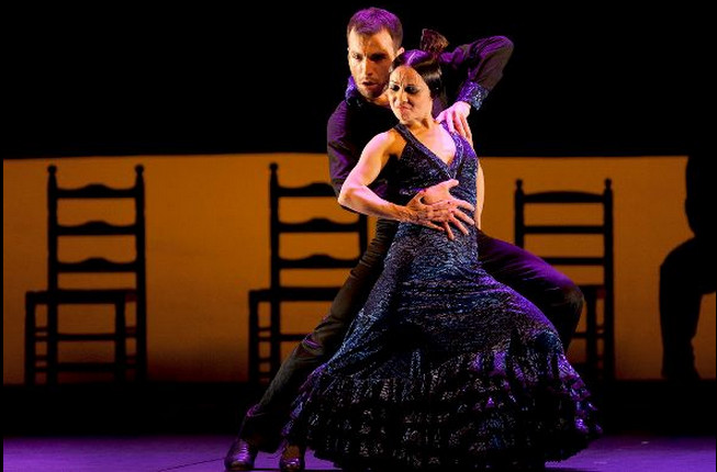 The gala on Tuesday featured four dancers, with honours slightly less evenly divided between them. Laura Rozalén was I think badly served by opening the show in silence; her style is quiet anyway, and without music I couldn’t seem to ‘hear’ what she was saying – the point, perhaps, but after that I found her hard to connect with. Olga Pericet and Marco Flores are both deeply appealing, sparkling performers, who pleased the audience immemsely with their by turns sensual and angry duet (pictured above right). But nothing could match the visceral power of gaunt, angular Mercedes Ruiz, who first appeared in an all-black bata de cola, representing Thanatos, and sent a chill down my spine when her castanets shivered into life, shrill like a death rattle. I assumed she was much older than her thiry-four years, and that’s a compliment (flamenco being, as far as I can see, one of the few art forms, or indeed professions, in which it is a positive boon to be a woman in her fifties). At the end of each dance, I was with the rest of the audience as they clamoured for more from Mercedes. (Those attending tonight or tomorrow might like to note that she obliged us with encores, and so did the other performers, leading to a run time at least half an hour longer than advertised...)