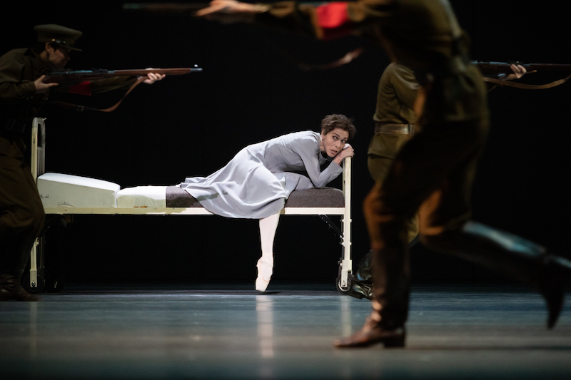 Against an aural backdrop of electronic burblings and music by Martinu, the woman, flanked by her nurses and psychiatrists, watches scraps of flickery home movies from the Romanov archive. Well-heeled visitors come to gawp at her. She suffers flashbacks, some benign, some terrifying, but all of them a feasible reaction to the stories that are fed to her. Laura Morera (pictured above), in her final role before retirement, is riveting to watch, whether sprinting dementedly around the perimeter of the stage, or wrestling with nightmare visions of her nemesis, the creepy Rasputin, or rifle-wielding Bolsheviks. It’s a priceless role for a dancer of Morera’s dramatic gifts, and MacMillan’s experimental expressionism (a style he rarely visited again) gives them thrillingly free rein.