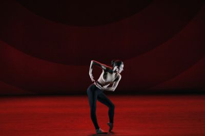 Emotional intensity isn’t exactly a City Ballet characteristic, but there was no need to worry. Outlier, set to Thomas Adès’s violin concerto Concentric Paths, is another successful foray into the strange landscape of McGregorworld, all angular peaks and organic curves, flashing superhuman limbs and vulnerable buckling undulations. It begins with a woman (Tiler Peck) standing alone in the middle of a red-ringed circle on a darkened stage (pictured right). A man (Craig Hall) walks around her as low, slightly ominous sounds (a snatch of prerecorded music from the film Solaris) begin. Then he takes her hand and moves in close with swerving upper-body arcs that seem to propel her into motion; the effect is of a force-field between them, as if the air that he displaces moves her in turn.