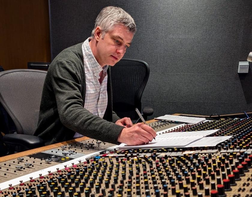 BERNARD HUGHES: I discussed the brief with Richard from the very start, and there were two big considerations. Namely “what do you want it to sound like?” and “what can we afford?”. I went with the smallest ensemble possible with which to realise what he required. We had a small string section which our brilliant engineer Nick Taylor made sound much larger. Plus an oboe, piano and harp along with two percussionists.