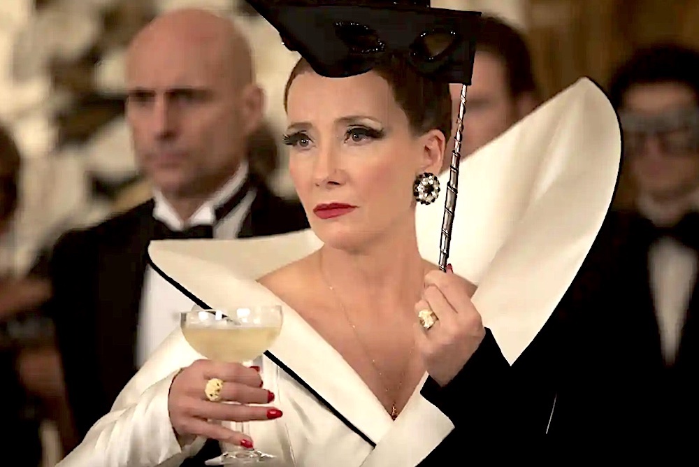 Besides, we’ve had a consciousness-revolution about animal welfare since 1956, when Dodie Smith published her original Hundred and One Dalmatians novel. Smith’s Cruella was the acme of heartlessness, a woman keen to skin Dalmatian puppies for their fur. In this new Cruella-world, there are a mere three Dalmatians, trained to pounce at the command of their mistress, the Baroness (Emma Thompson, pictured below). Heinously, the Baroness describes her dogs as “savage”, when dog-lovers know that Dalmatians are adorably daft and affectionate.